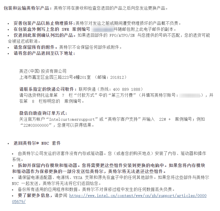 诊断无果,英特尔对于设备寄回的要求是,提供套件的型号、SN和SA码,以及当时购买的凭证(比如纸质发票)。英特尔对于NUC这个产品的保修政策是,能提供纸质发票,在一年以内(时间以当时出现问题申请出现计算)套件出现问题,直接更换全新套件; 超出一年未满三年更换官方翻新套件。
