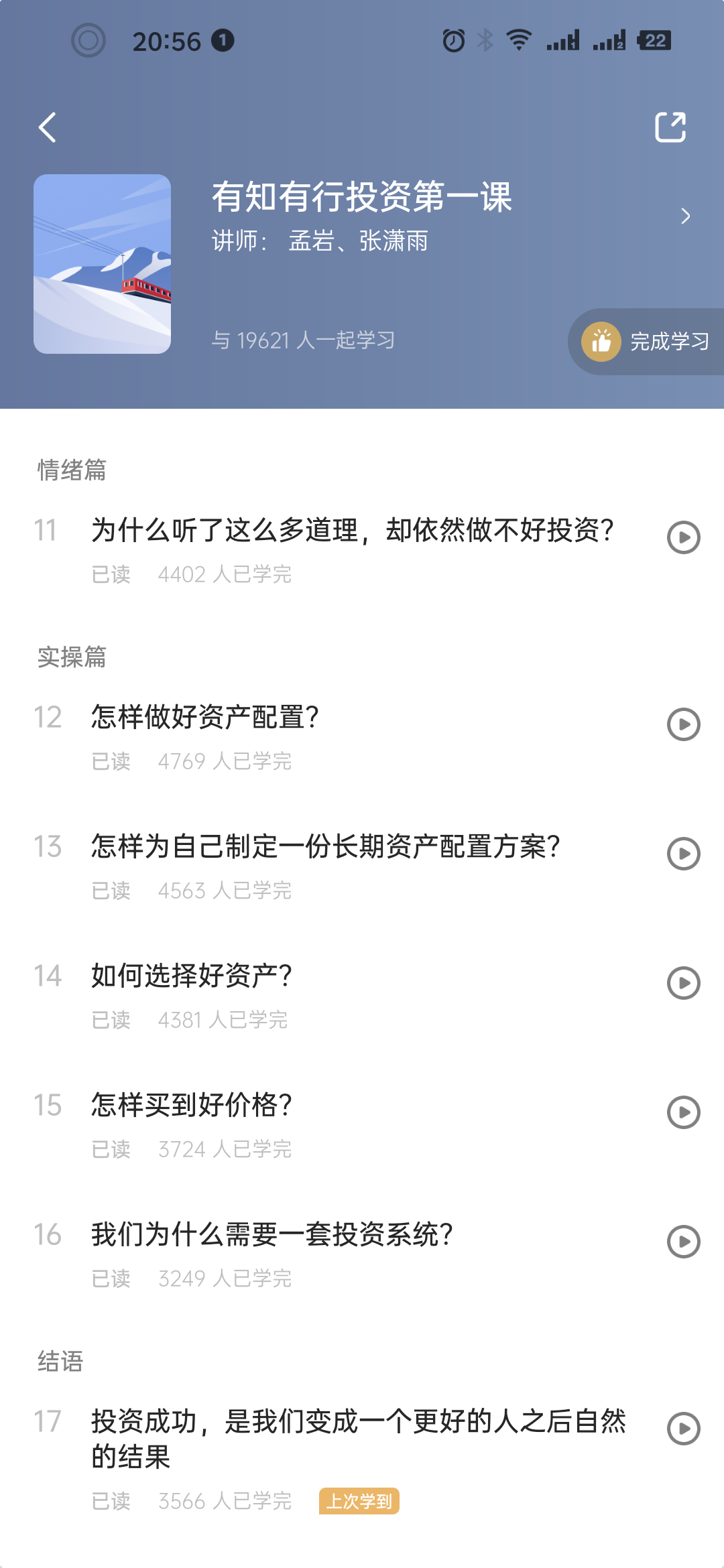 目前里面我最为推荐的是两位创始人孟岩和张潇雨制作的投资体系课,我觉得这门课程要是收费的话,价格四位数以上绝对没毛病,但重点就在于优质且免费。